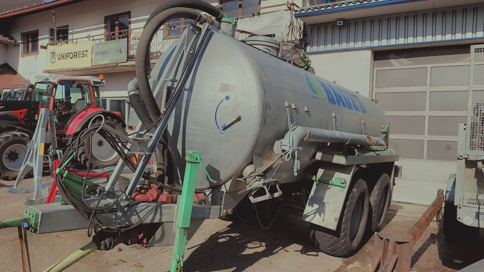 Zu den herausragenden Ausstattungsmerkmalen dieses Vakuumfasses gehören eine Saugleitung und hydraulische Bremsen, die für eine sichere und präzise Handhabung sorgen. Der integrierte Breitverteiler ermöglicht eine gleichmäßige Verteilung der Gülle über die Felder, während das Luftrührwerk für eine homogene Mischung der Gülle sorgt und Verstopfungen vorbeugt.