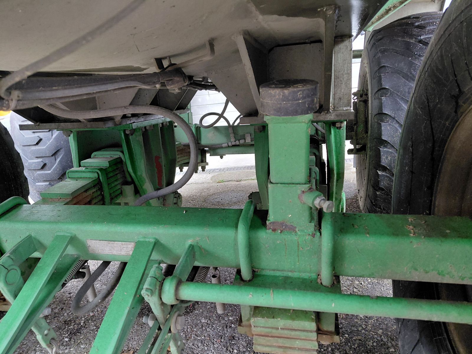 Das gefederte Achsaggregat erhöht den Fahrkomfort und schützt die Struktur des Fasses auch bei unebenem Gelände. Zudem ist das Fass mit einer hydraulisch sperrbaren Achse ausgestattet, die zusätzliche Stabilität beim Transport bietet.